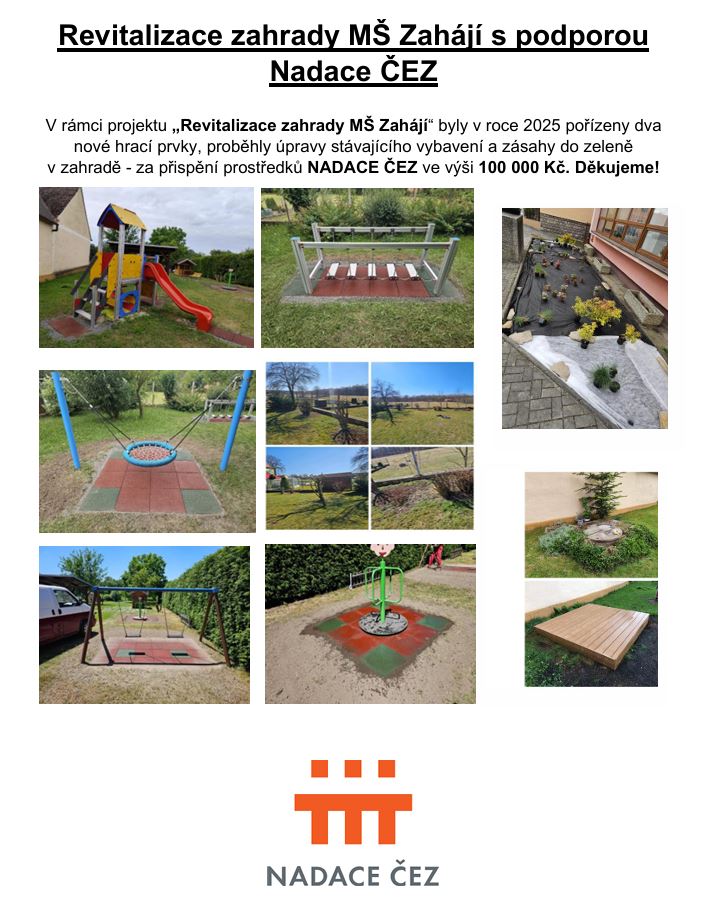 V roce 2025 jsme požádali v rámci grantového řízení Podpora regionů Nadace ČEZ finanční podporu projektu Revitalizace zahrady MŠ a získali maximální příspěvek ve výši 100 000 Kč. Projekt úprav byl připraven ve spolupráci s personálem MŠ.